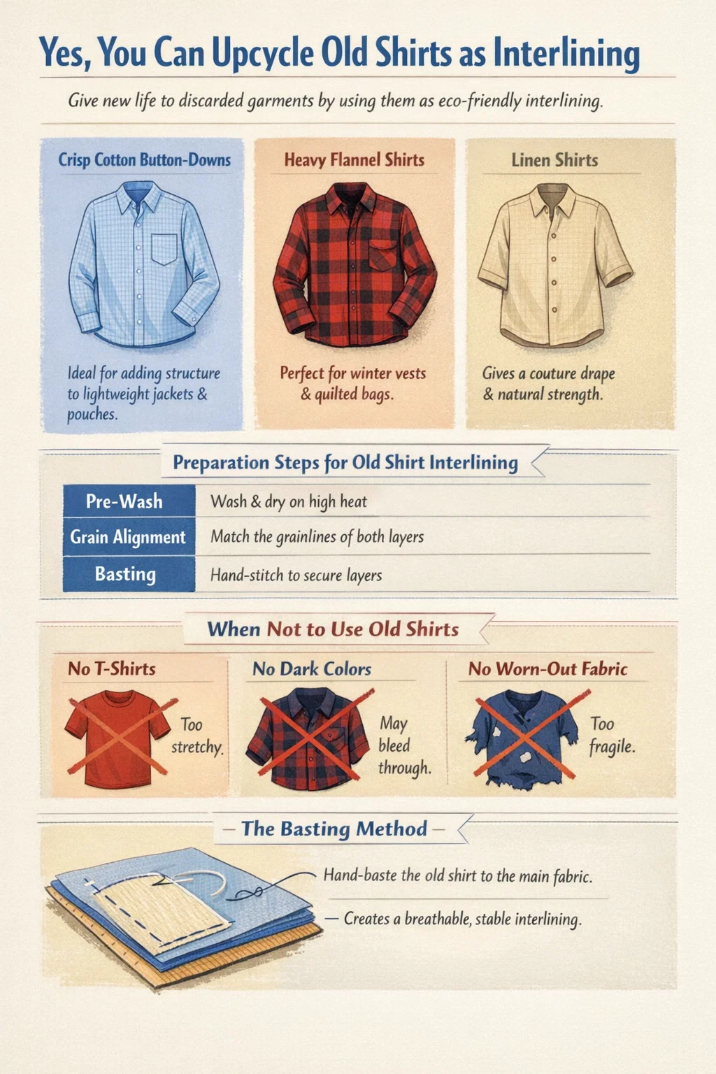 Lorsque vous utilisez une vieille chemise, vous devez la « faufiler » sur l'envers de votre tissu principal. Cela implique de longs points de suture temporaires qui maintiennent le entoilage en place jusqu'à ce que les coutures finales soient cousues. Cette méthode permet aux couches de bouger légèrement indépendamment, ce qui crée un vêtement plus confortable et plus respirant que la sensation rigide et plastique de certains adhésifs modernes. En choisissant cette approche traditionnelle, vous n’économisez pas seulement de l’argent ; tu es souvent améliorer la qualité et la longévité de vos articles faits à la main.