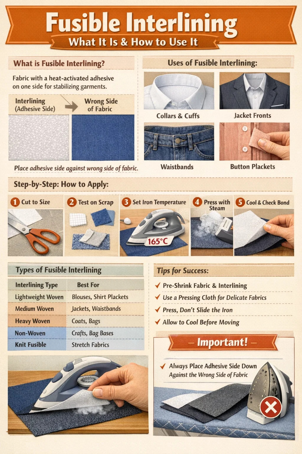 | Entoilage Type | Idéal pour | Correspondance des tissus | Température du fer |
