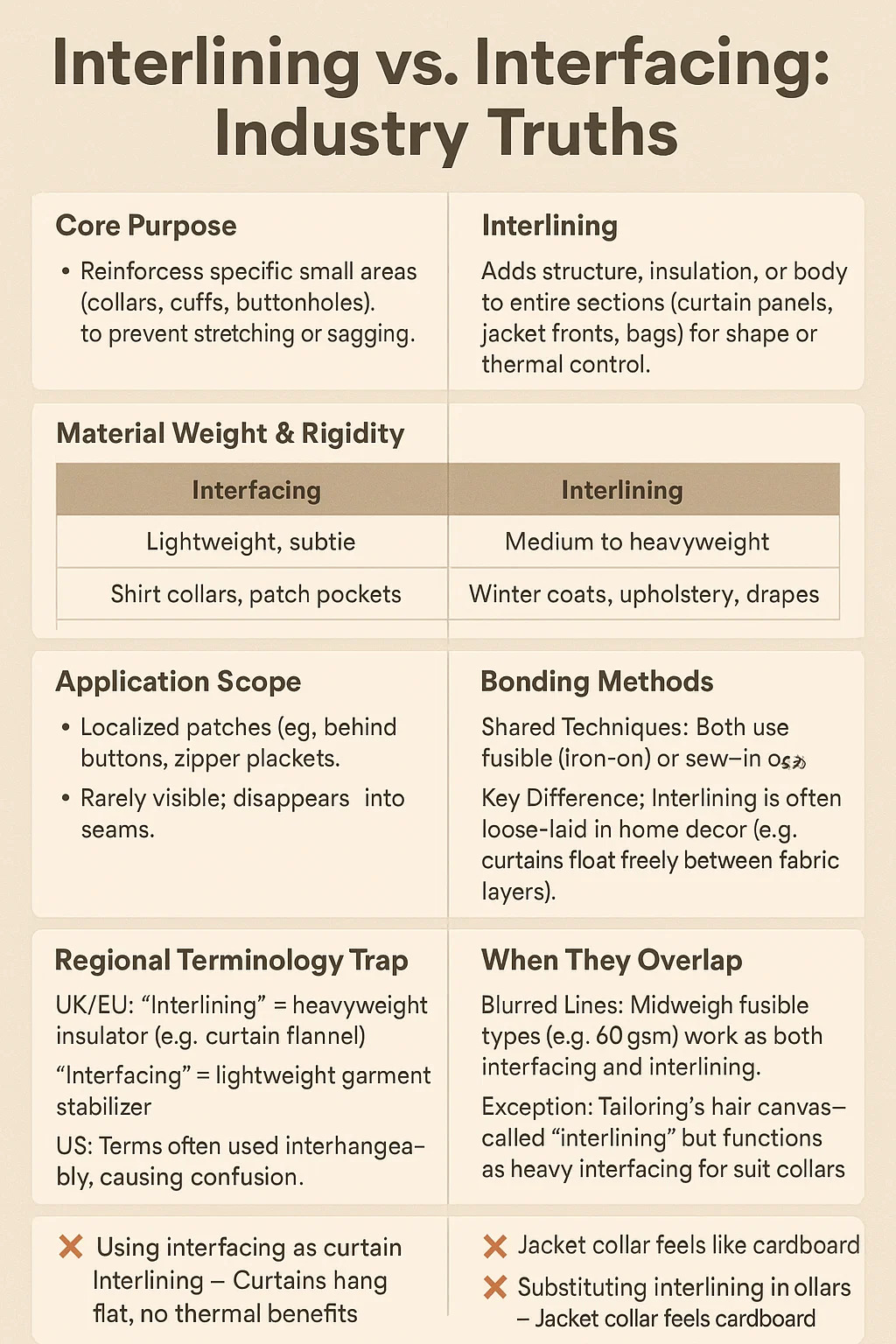 Entoilage : ajoute de la structure, de l'isolation ou du corps à des sections entières (panneaux de rideaux, devants de vestes, sacs) pour la forme ou le contrôle thermique.