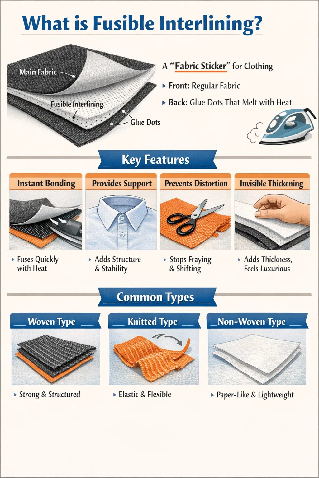 L'entoilage thermocollant est un type spécial de tissu auxiliaire avec de la « colle » au dos. C'est un matériau très courant dans la confection moderne de vêtements, ce qui rend la production de vêtements plus simple et plus efficace.