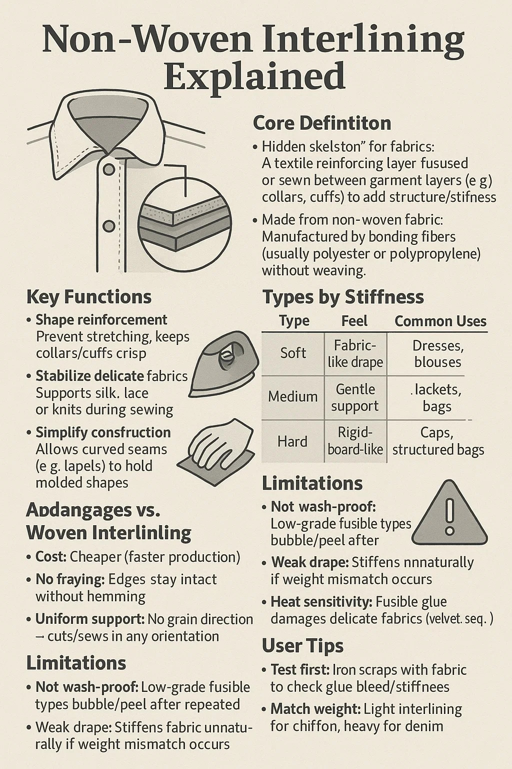 "Squelette caché" pour les tissus: une couche de renforcement textile fusionnée ou cousue entre les couches de vêtements (par exemple, cols, poignets) pour ajouter la structure / la raideur.