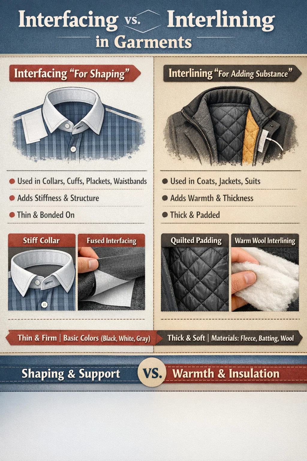 Sensation : généralement plus épais et plus doux que l'entoilage, les matériaux courants incluent le molleton, le molleton ou même les tissus en laine.